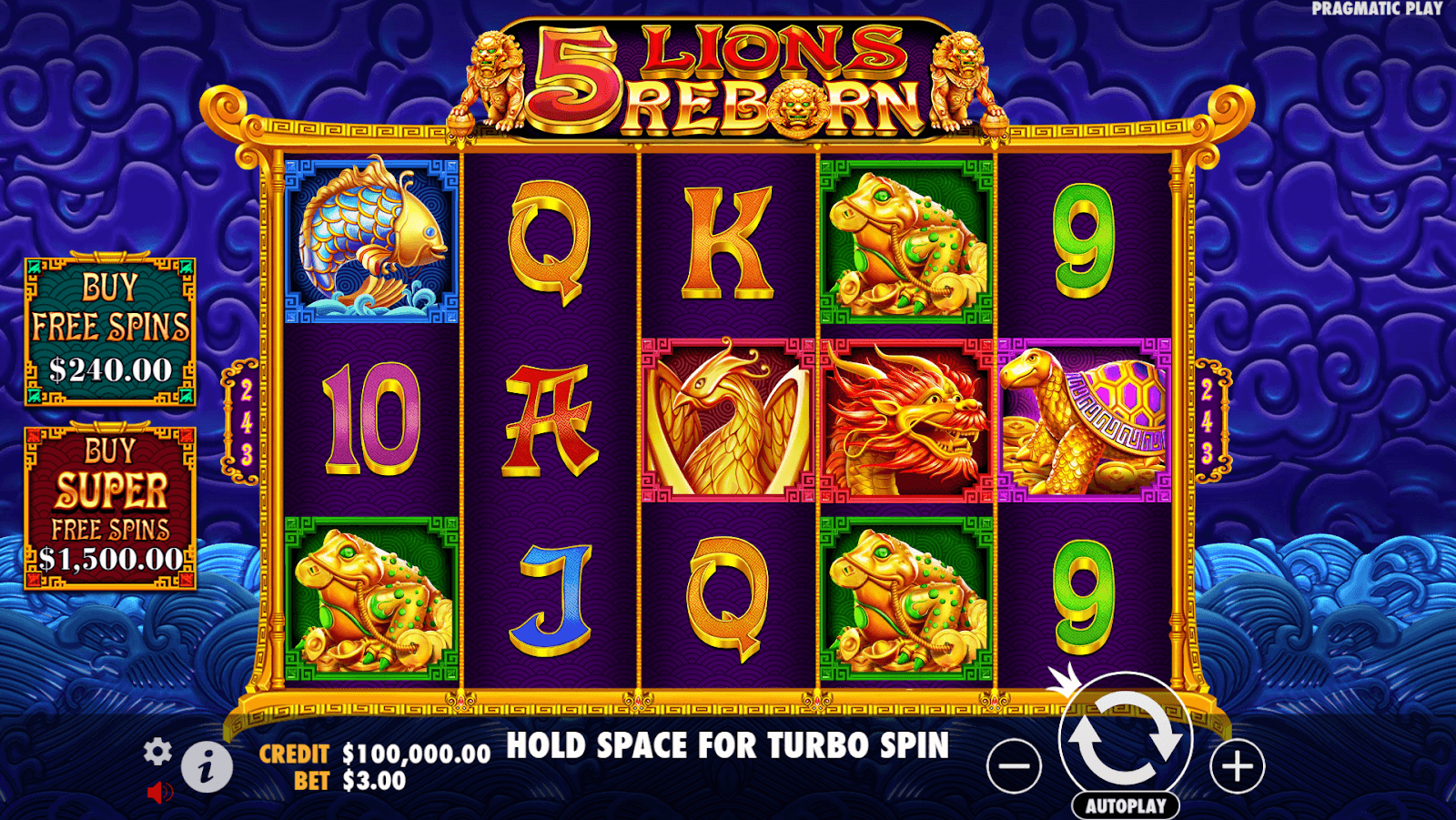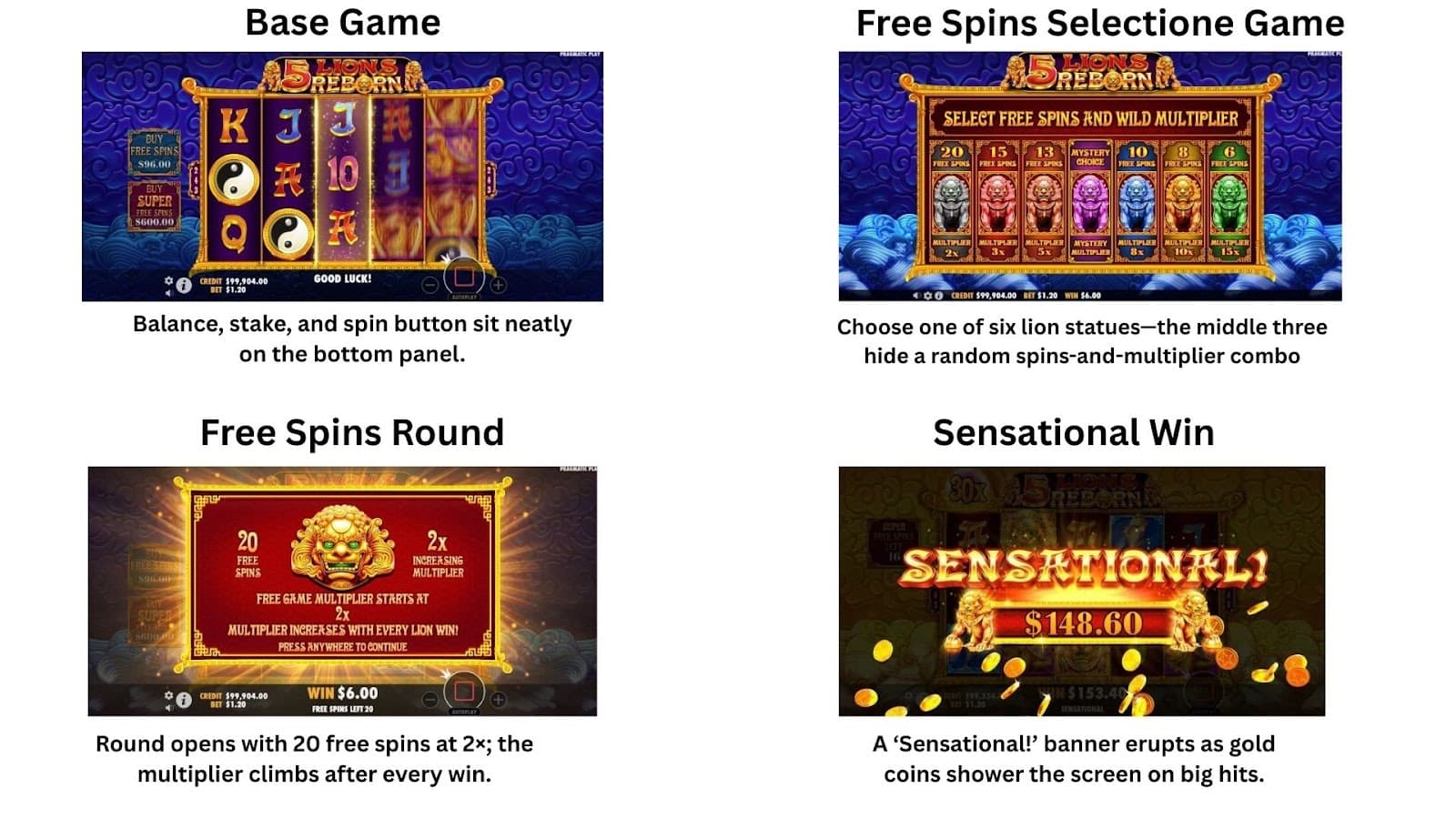 5 Lions Reborn présente des graphismes riches et détaillés centrés sur un décor de temple de jade, où les symboles du phénix, de la tortue et des carpes koï brillent en filigrane doré orné. De subtiles éruptions de particules et des éclats de lumière ajoutent une touche raffinée et dynamique sans pour autant altérer l'esthétique traditionnelle chinoise.