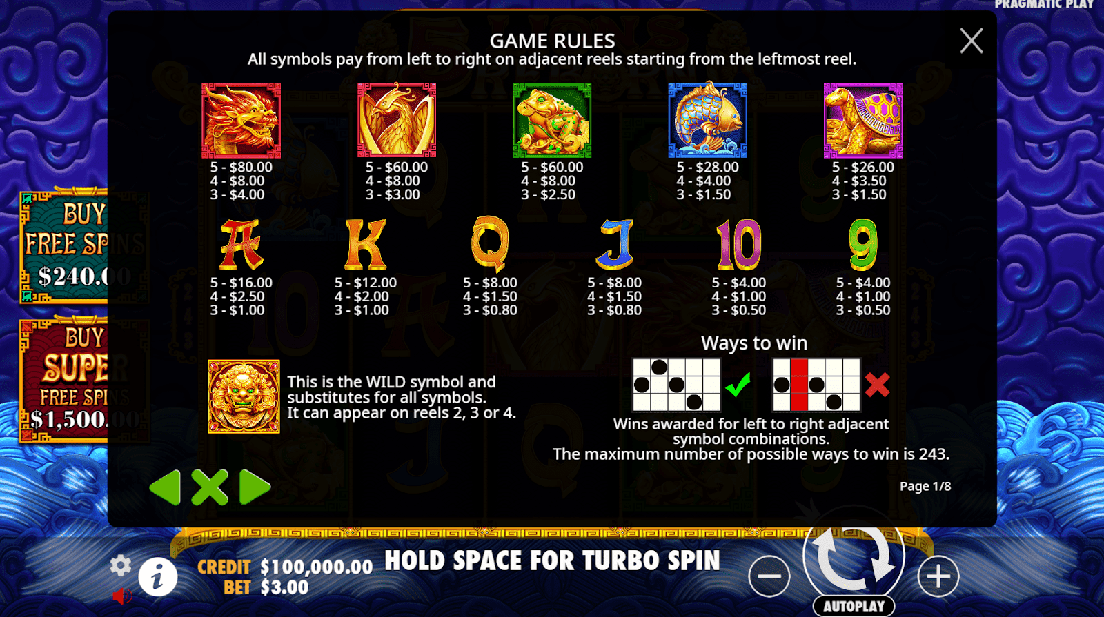 5 Lions Reborn, développé par Jeu pragmatique, est une machine à sous captivante à haute volatilité qui invite les joueurs dans un temple de jade mythique regorgeant de bêtes dorées. Il tourne sur une grille 5 × 3 avec 243 façons de gagner, un RTP généreux de 96,50 % et des mises de 0,30€ à 240€. Le Turbo et les tours automatiques de 1 à 1 000 tours permettent de maintenir le rythme, tandis qu'un achat de fonctionnalités (80 × pour les tours gratuits standard ou 500 × pour les super tours gratuits) procure de l'adrénaline instantanée. L'enthousiasme du jeu de base provient des primes cumulées et des Dragon Wilds dotés de multiplicateurs aléatoires de 2 à 35 ×.
